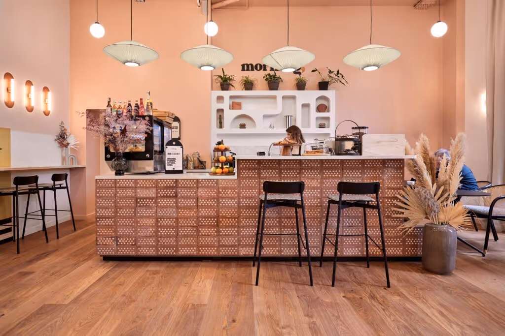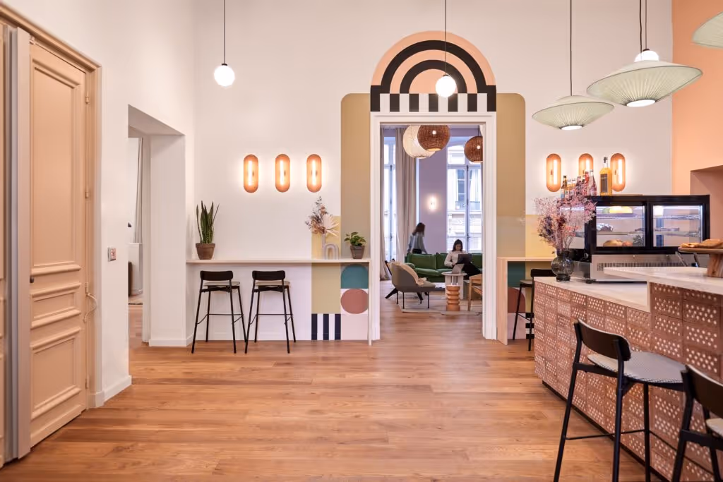 Morning Penthièvre est un espace de travail à la fois convivial et accueillant mais également propice à la concentration. Les motifs Memphis alliés aux tons terracotta font écho à cette ambivalence. Ce choix chromatique renvoie un univers intimiste, le rythme des motifs renforce l’esprit d’échange et de partage.