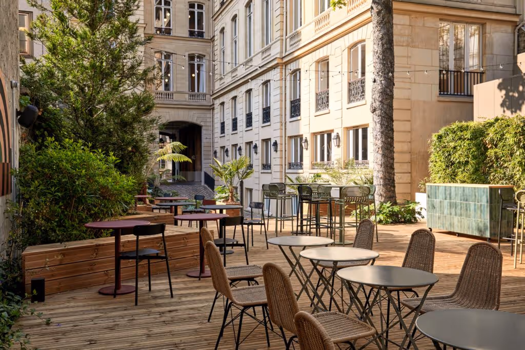 Terrasse de Morning Penthièvre, mobilier en jute et guirlande