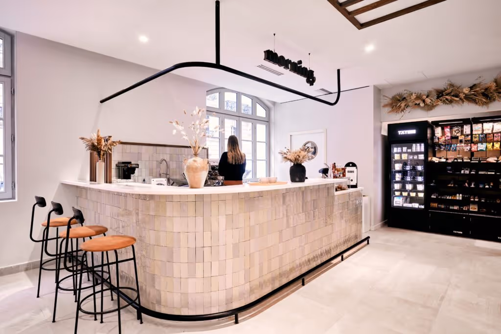 Le comptoir du rez-de-chaussée propose des boissons chaudes et des viennoiseries en tous genres. Pour le déjeuner, une gamme de plats chauds et froids est également servie. Info (très) pratique : le paiement au comptoir peut se faire avec la carte de tickets-restaurants Swile. Par ailleurs, un stand Totem est disponible à proximité du comptoir en guise de dépannage pour produits alimentaires ou d’hygiène.